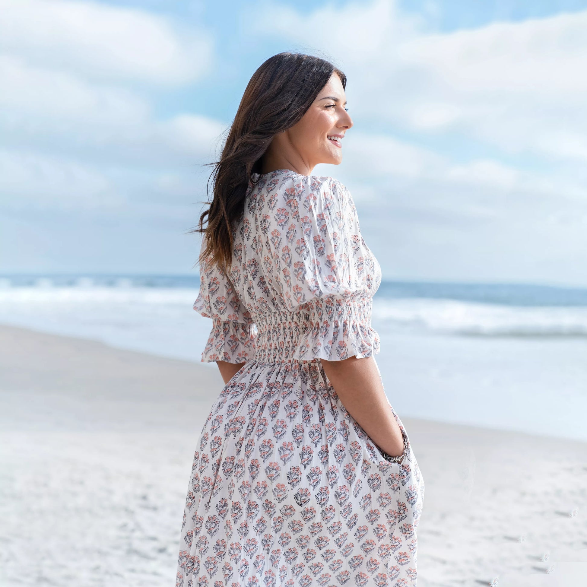 Lilienne blends timeless femininity with everyday ease. Featuring soft puff sleeves, a smocked waist, and a gently flared hem, this breathable cotton dress is finished with hand-block printed florals. Made to move with you and feel effortless from morning to night.