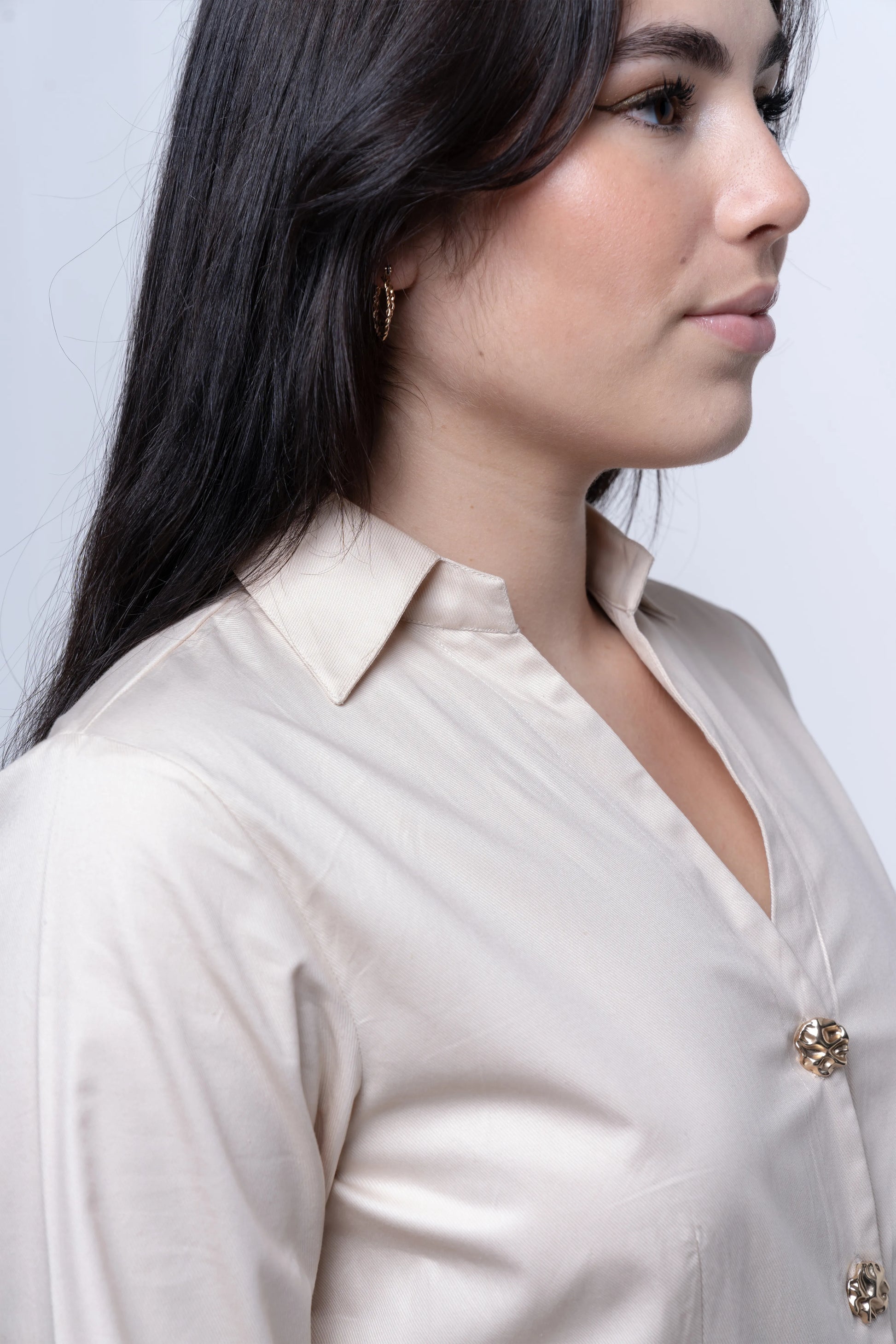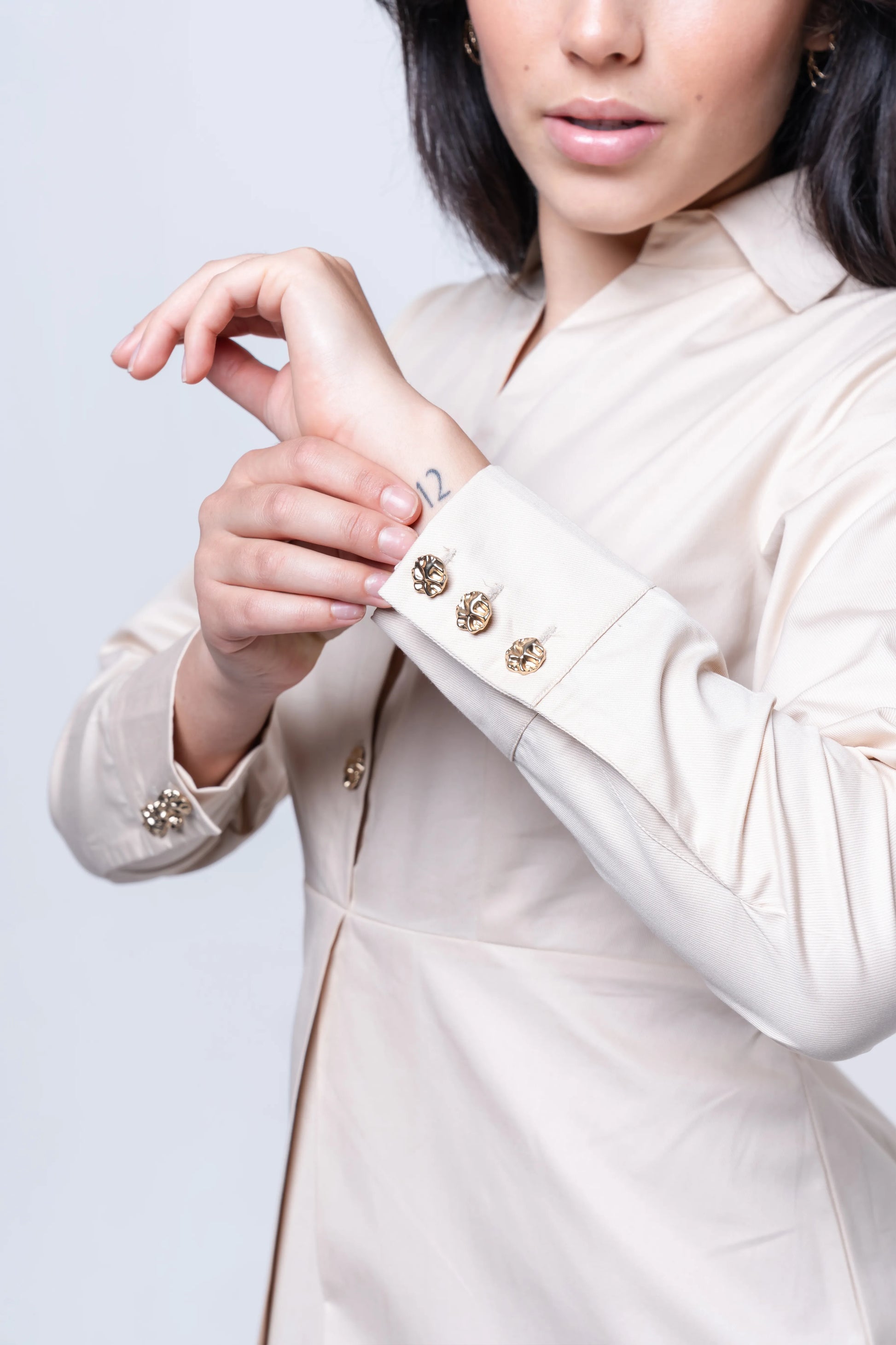 Minimal and polished, the Champagne Quartz Mini Dress is crafted in a soft neutral tone drawn from champagne quartz gemstones, known for their understated elegance. Tailored from 100% premium cotton, it maintains a structured form with a smooth finish. The clean shirt neckline and hand-attached gold designer buttons create a quiet luxury effect, while the subtle front pleat adds ease and movement. Thoughtfully tailored for comfort and style, it transitions seamlessly from day styling to evening polish. Style it effortlessly with stockings, sleek leggings, and classic boots for a chic winter look