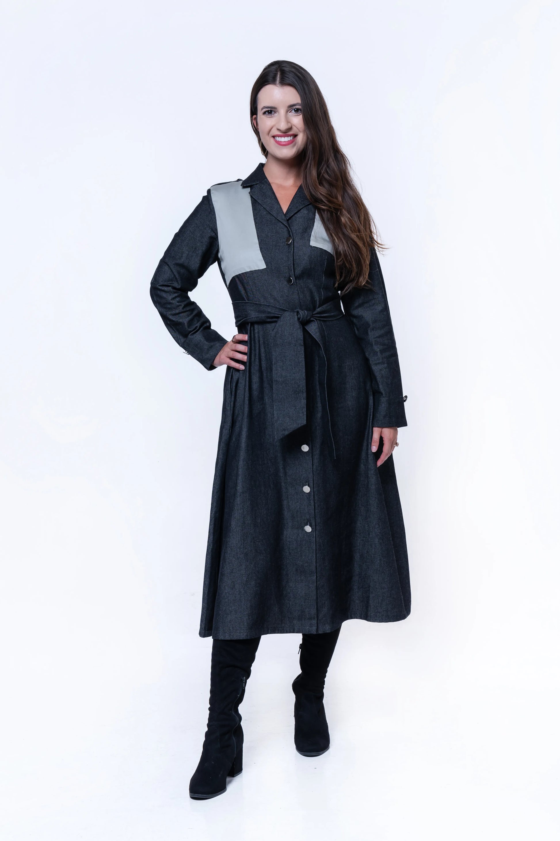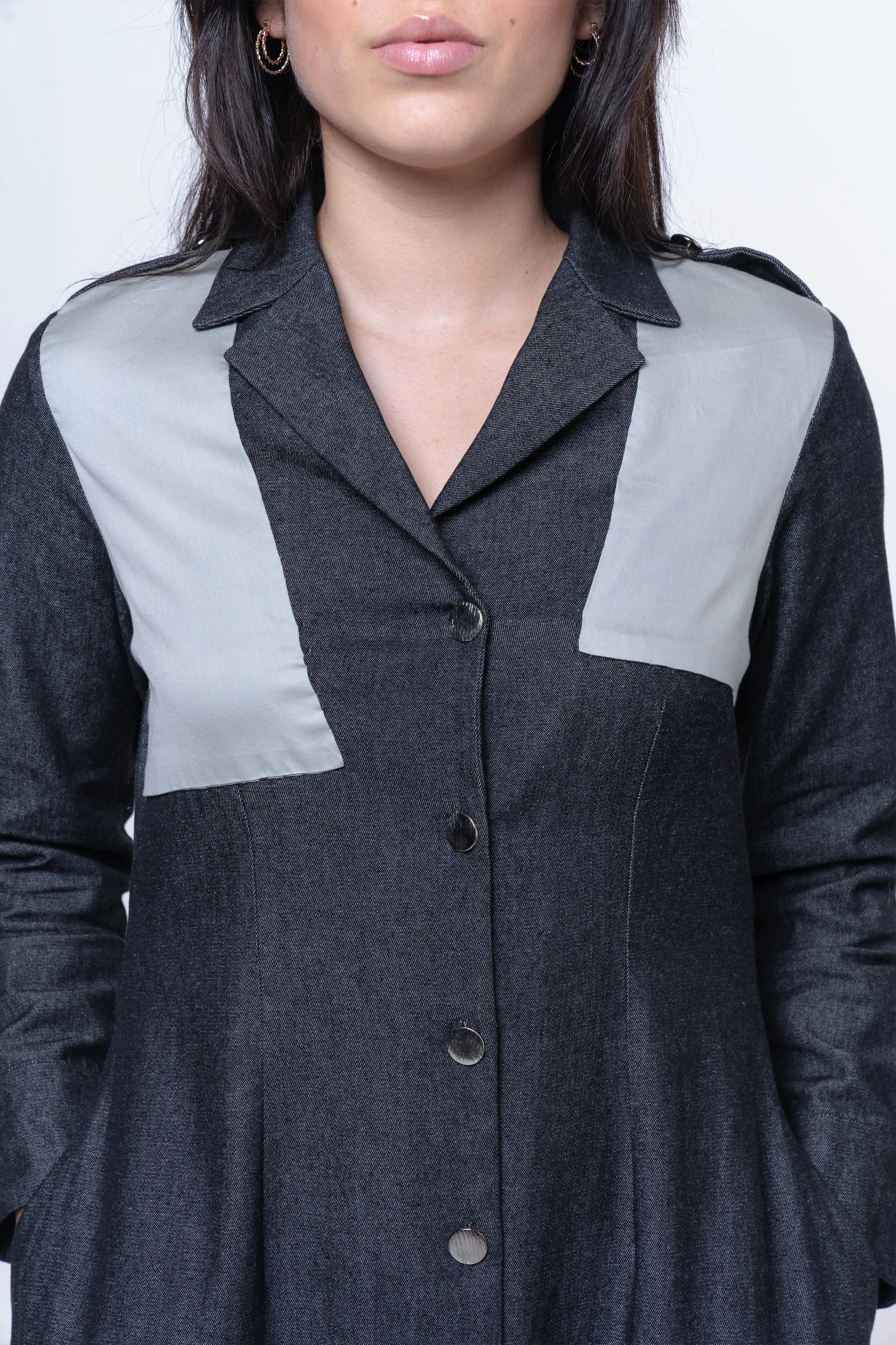 The Hematite Denim A-Line Dress is modern, strong, and architecturally clean. Echoing the mineral depth of hematite stone, this piece is cut from premium dark-wash denim and shaped with structured precision. Contrasting charcoal cotton paneling sharpens the shoulders and visually elongates the frame. Finished with metallic buttons and epaulette-style accents, it makes a statement in detail while remaining versatile. Functional side pockets add ease, making this a smart everyday signature.