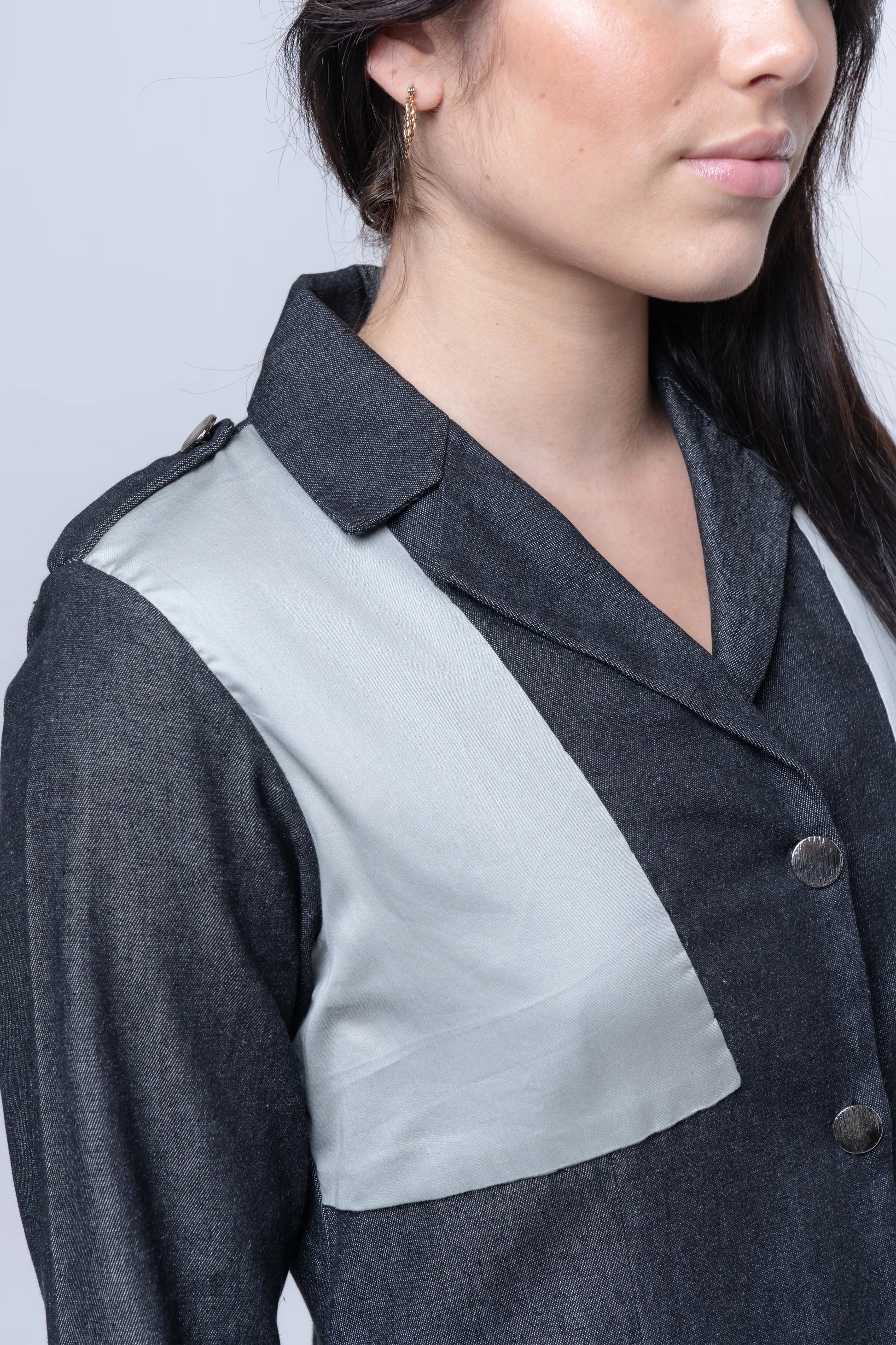 Premium Denim + Cotton Contrast · Buttons: Metallic finish
