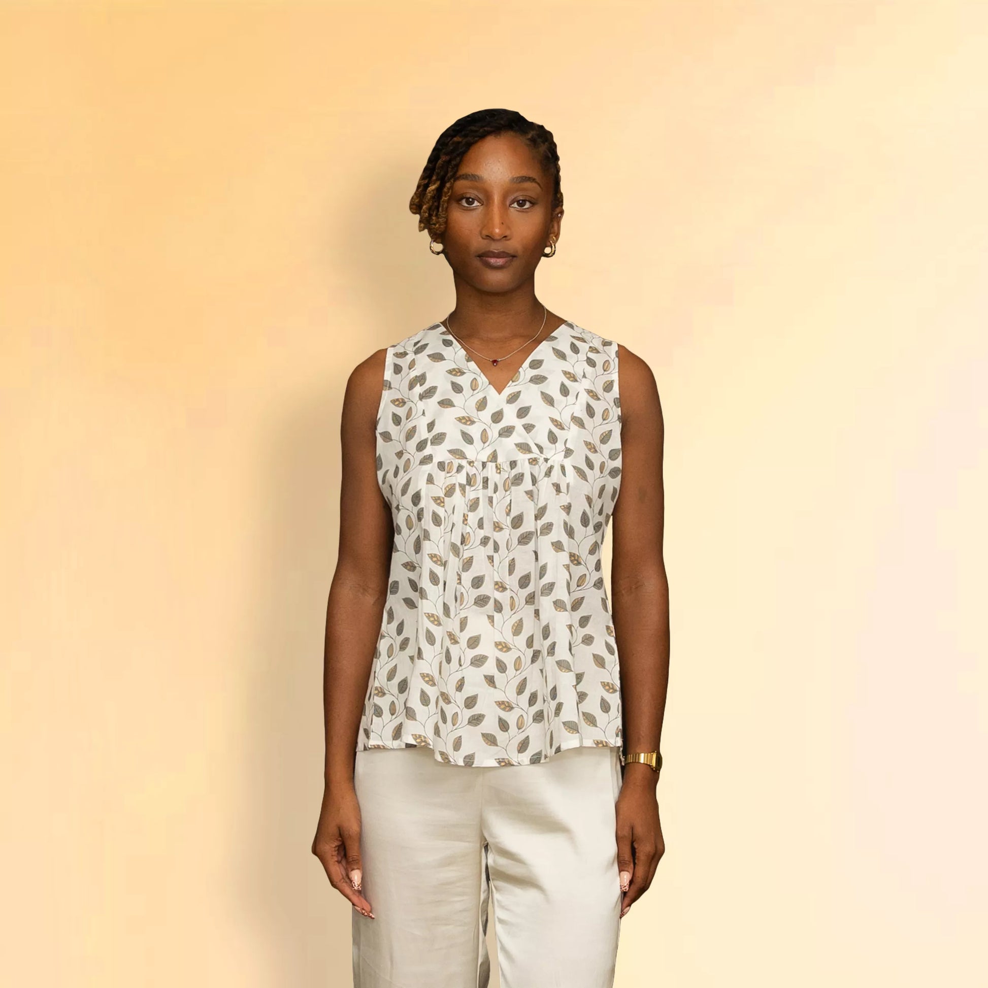 A sleeveless, V-neck blouse made with 100% pure cotton, designed for easy comfort and timeless charm. Featuring a delicate leaf print in earthy tones, the Nira Top gently gathers just below the bust for a naturally flattering, flowy silhouette
