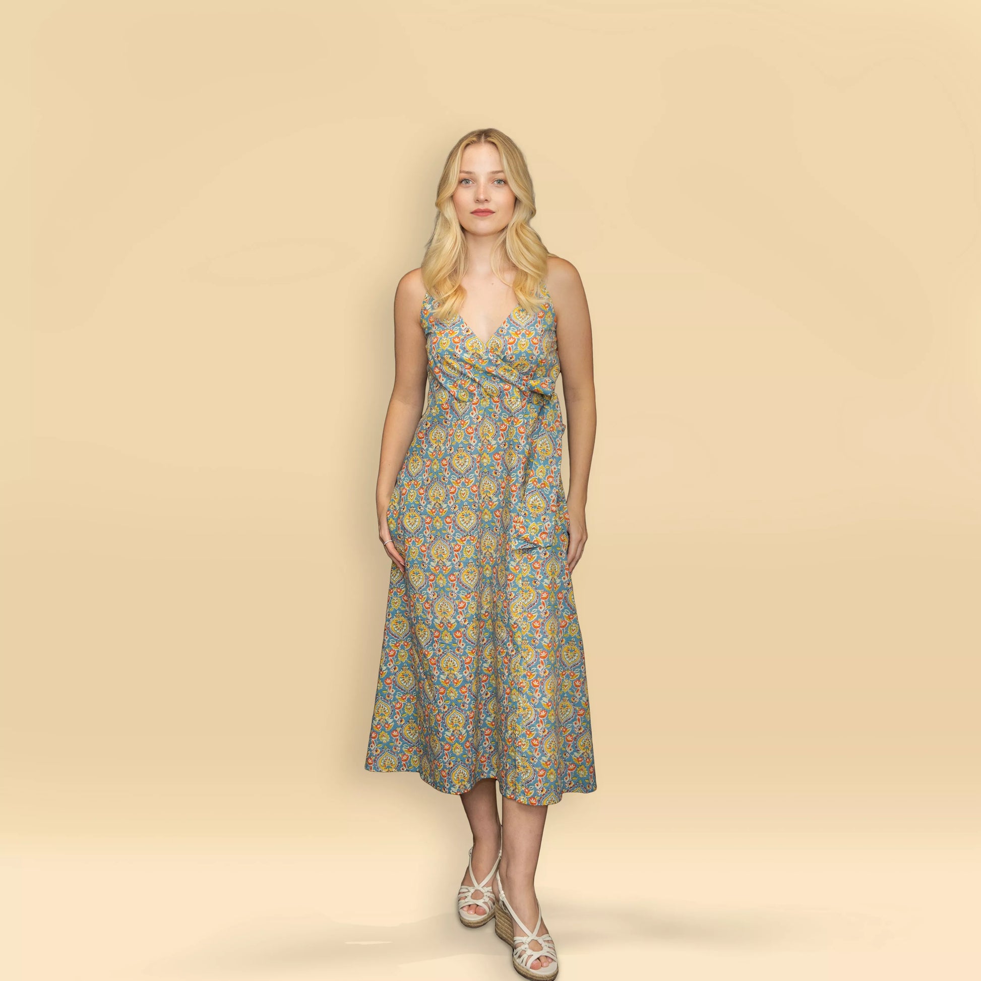 The Oraya dress is a flowing statement of quiet strength and refined beauty. Crafted from soft, breathable cotton, this wrap-style midi dress features a flattering V-neckline, adjustable shoulder straps, and a side tie closure for a custom, feminine fit.