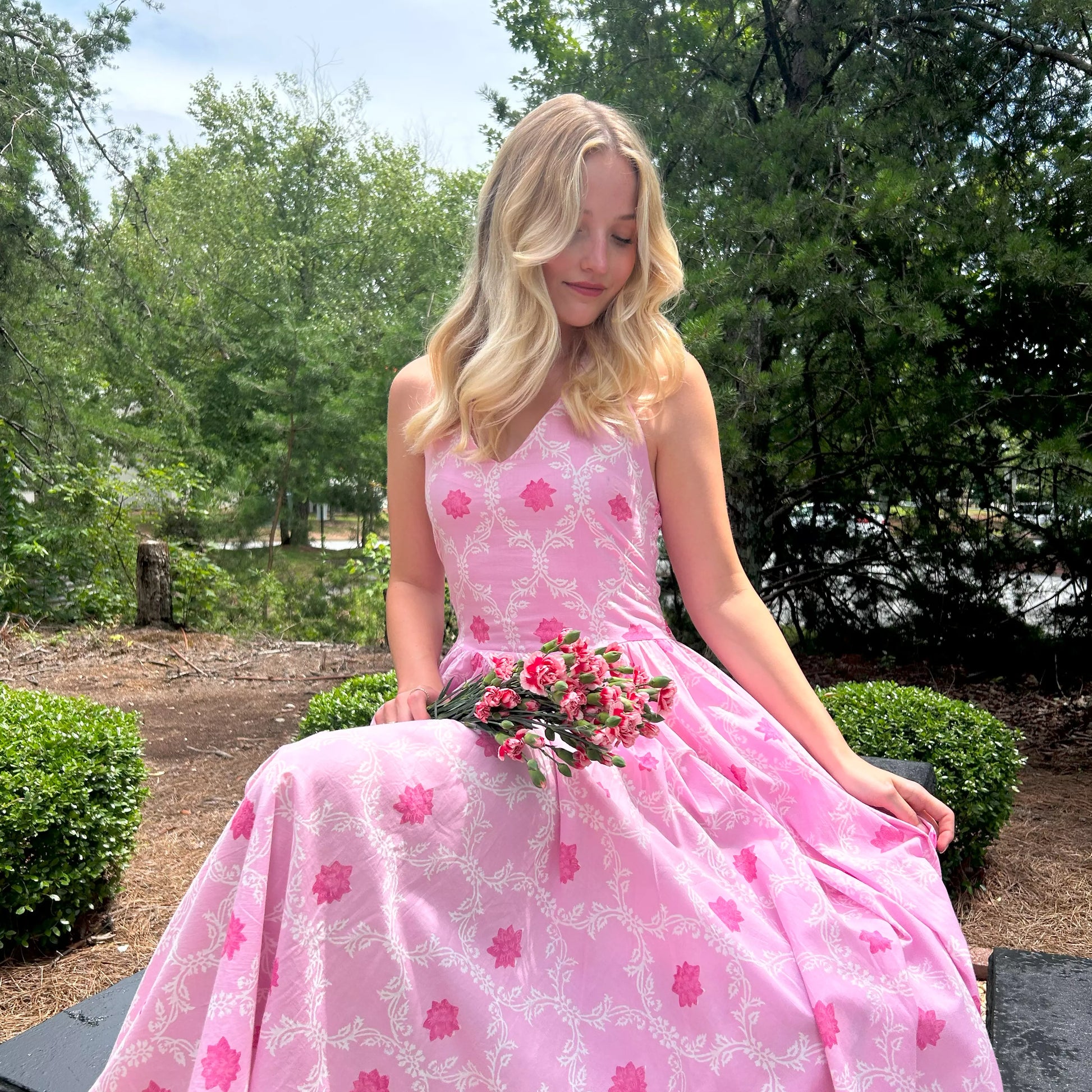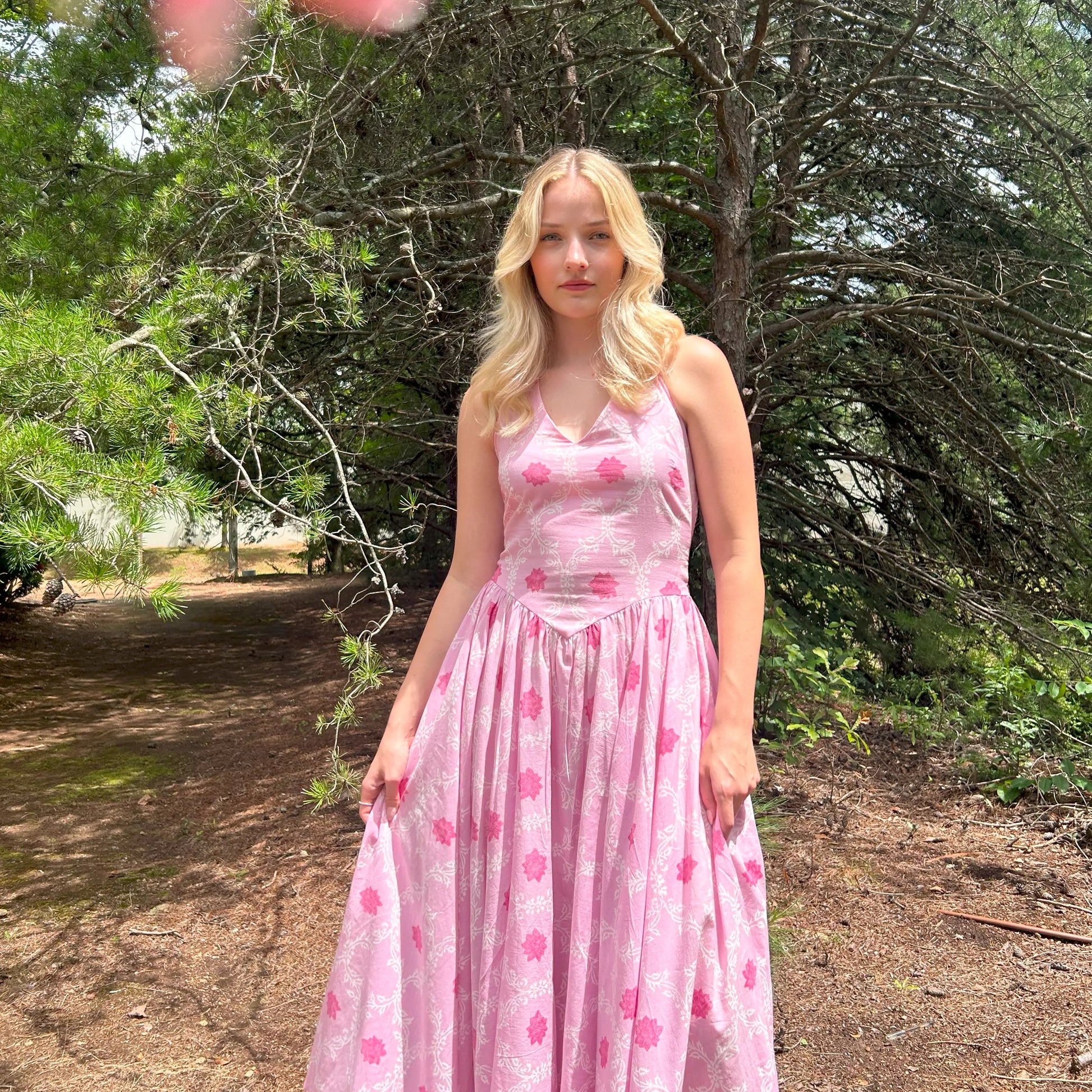 Each soft pink lotus is hand block printed using custom-carved blocks, created exclusively for this signature design. Every print tells a story of tradition, intention, and beauty rooted in the earth. Hidden side pockets add a touch of function to this artful piece.