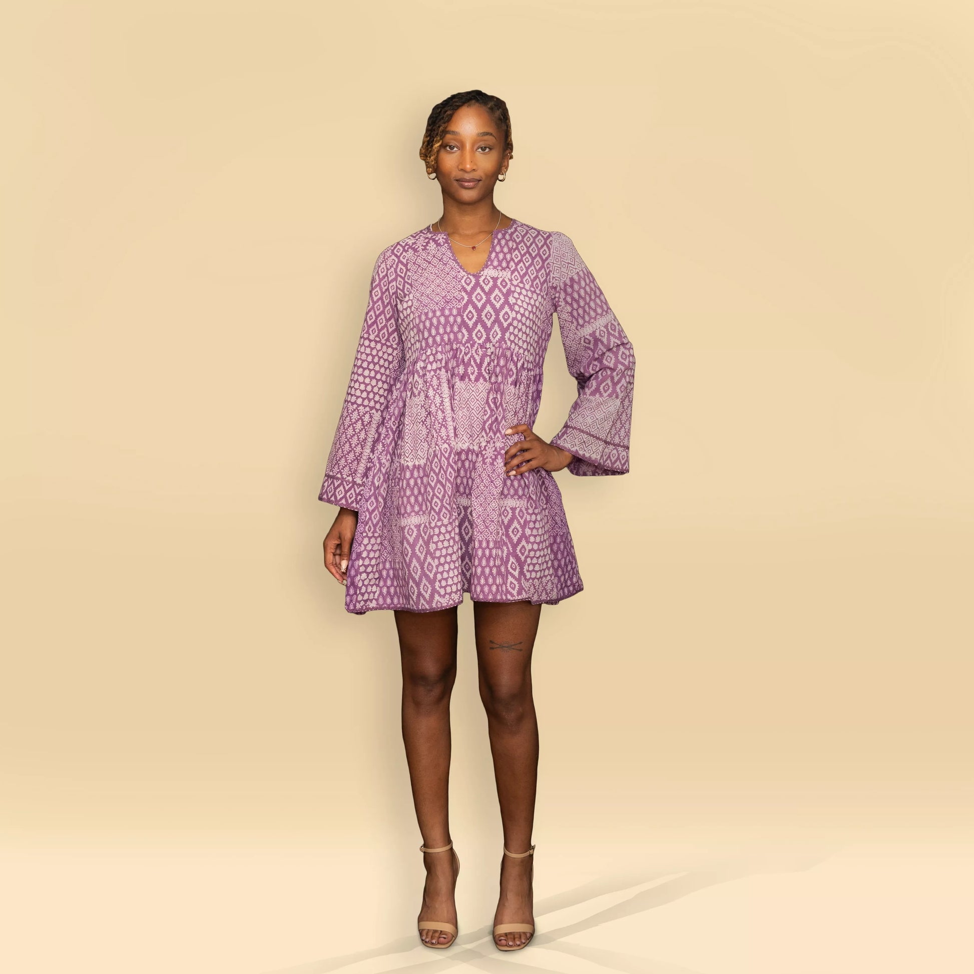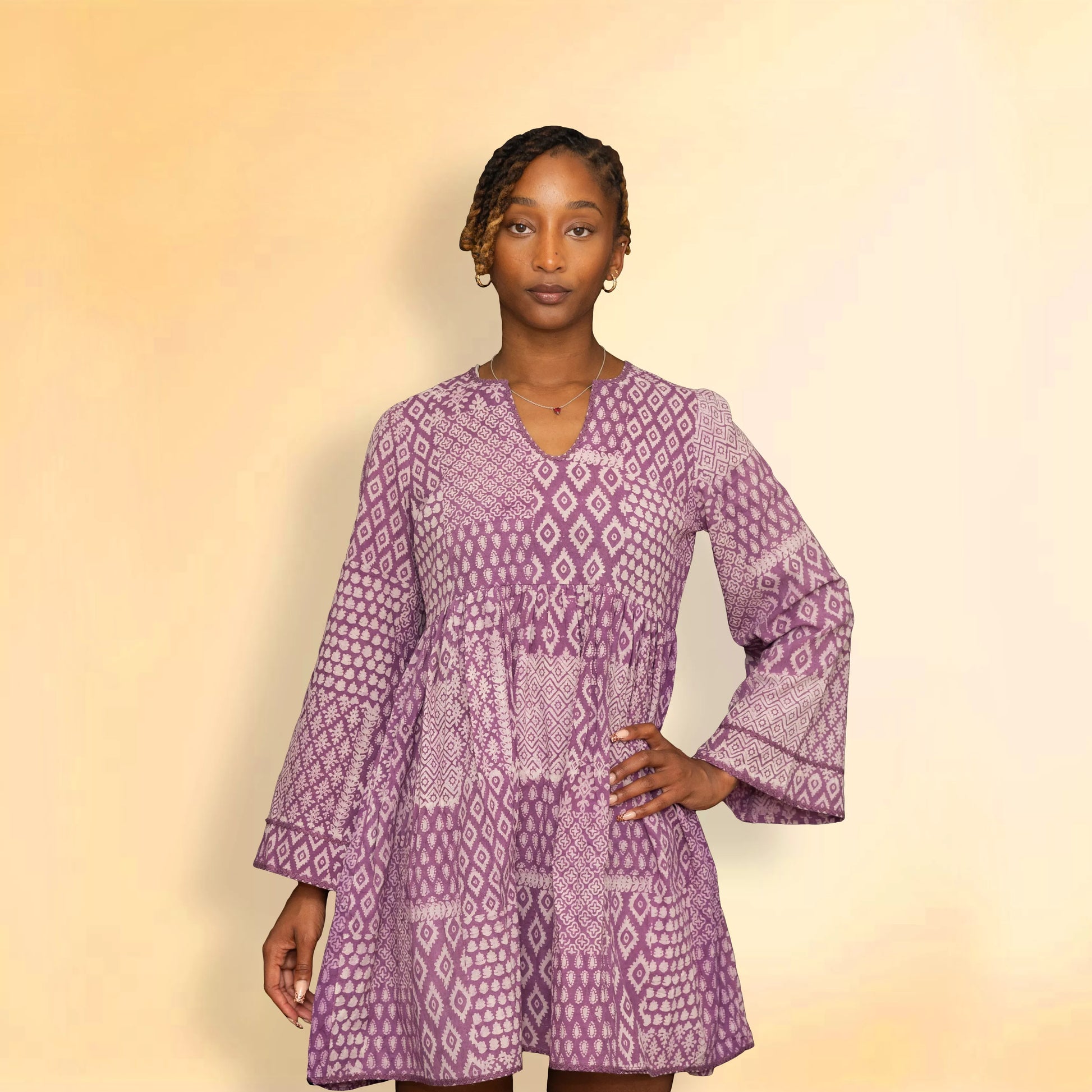 The Liora brings understated drama to everyday dressing. With soft geometric prints and graceful bell sleeves, it makes a statement in the most subtle way. The deep V neckline and gently cinched waist create a flattering silhouette that’s as easy to wear as it is polished.